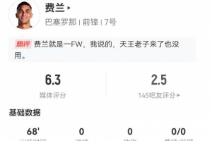 体育资讯2月26日讯 巴萨在本轮国王杯4-4战平马竞,费兰本场数据如下: