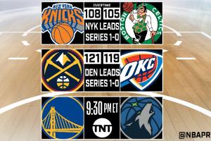 体育资讯05月07日讯 NBA季后赛次轮G1,步行者121-112击败骑士,尼克斯108-105击败凯尔特人,掘金121-119击败雷霆。